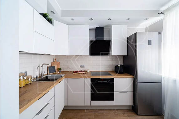 Хорошо смотрится белая кухня, в которой присутствуют деревянные поверхности. Древесные текстуры привносят в интерьер атмосферу тепла и уюта. Приятным дополнением обстановки в данном случае станет свежая зелень. Это могут быть цветы в вазах или в горшках.