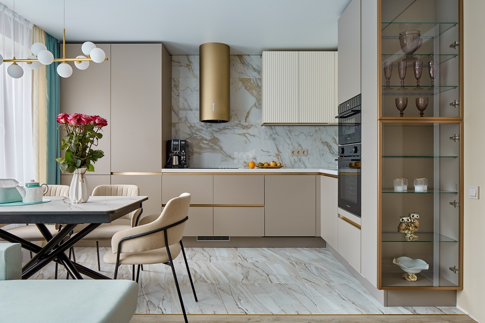 3. Высота. Размер верхних шкафов кухни зависит от планировки помещения и колеблется в пределах 70–90 см. Чем выше потолок, тем длиннее можно делать фасады. При этом важно учитывать средние размеры кухни: слишком большие навесные модули в небольшой комнате будут визуально утяжелять интерьер. Мы в КД не ограничены в высоте современной кухни и можем реализовать проект любой конфигурации.