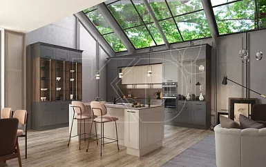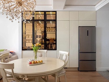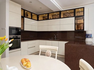 Подобные гарнитуры выполняют в сдержанных нейтральных оттенках. Модерн – сочетание традиционных и классических линий, поэтому для отделки фасадов применяется лаконичный декор, стеклянные и металлические вставки.