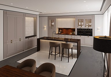 Дизайн кухни в стиле классика привлекает внимание своей роскошью. Для отделки фасадов применяются резные узоры, лепнина, позолота, патина, рамки.
