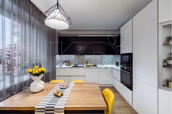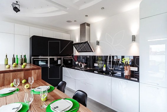 Сегодня популярностью пользуются кухни с фотопечатью. Благодаря современным технологиям возможно использовать печать различных изображений и для оформления мебели, и для декора фартука. Можно выбрать принт абсолютно любой тематики: флористический, анималистический, в виде натюрмортов, репродукций картин, орнамента. Выполненные в стиле модерн черно-белые кухни в цветах смотрятся особенно эффектно.