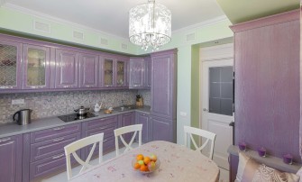 - Отсутствие ограничений по стилю. На первый взгляд может показаться, что для фиолетового трудно найти место в классике. Но если это направление неоклассики, то фасады будут смотреться необычно и выразительно. Не менее интересно смотрится этническое воплощение традиций разных стран в мебельной моде. В современных стилях нужно лишь грамотно подобрать цвет-компаньон. Например, в хайтеке таковым может выступить графитовый, серебристый.