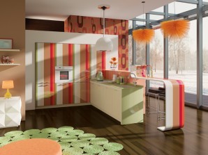барной стойкой, над которой предусмотрены легкие открытые полочки. Подобный гарнитур не только выглядит необычно и эффектно, но и наиболее эффективно решает задачу по отделению кухонной зоны от зоны отдыха – например, в квартире-студии.