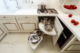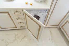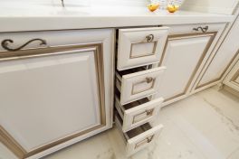 Кухонный гарнитур – тонкая работа мебельных мастеров. Фасады из МДФ молочно-белого оттенка собрали по той же технологии, что и настоящие деревянные: рамки и филенки соединяли друг с другом по отдельности. Сверху поверхность покрыли патиной оттенка припыленного серебра. Все ящики дополнили изогнутыми ручками под состаренное серебро в тон патине. П-образную кухню спланировали таким образом, чтобы она была удобна для человека с ограниченными возможностями. Основную рабочую столешницу опустили на 10 см от стандарта, а у окна разместили обыкновенный стол без ящиков, чтобы его можно было использовать, сидя в коляске. Кроме того, два верхних шкафчика повесили ниже обычного уровня, чтобы сделать их доступными для героини. Духовой шкаф размещен в нижнем ярусе, рядом со столом без ящиков: хозяйка сможет подъехать к духовке максимально близко. Чтобы облегчить доступ, в нижнем ярусе справа от мойки разместили сушку для посуды с решеткой для чашек и держателями для тарелок (в нее будет удобно складывать посуду из посудомойки). Над выдвижной сушкой – ящик для столовых приборов.Чтобы задействовать все полезное пространство, нижний угловой шкаф оснастили выдвижными полками в виде неправильной восьмерки. Здесь отлично поместятся кастрюли, сковородки и другие крупногабаритные предметы. Верхние центральные шкафчики опустить было невозможно, так как в один из них встроена вытяжка, которую необходимо вешать на расстоянии не менее 70 см от плиты. Поэтому левую секцию оснастили лифтовым механизмом, который позволяет опускать содержимое полки до комфортного уровня. Ручку механизма можно привести в движение крючком от половника или любым другим предметом.Вторая рабочая поверхность стандартной высоты, так что будет удобна для дочери героини (к тому же под столешницей встроена бытовая техника). Над рабочей зоной повесили буфетный шкафчик с точеными пилястрами и стеклянными дверцами с фацетом и гравировкой. Фартук под ним отделан наборными панелями «Буазери». В две симметричные колонны встроены отдельные холодильник и морозильник: хранение продуктов специально разнесли по двум секциям, чтобы хозяйка могла без труда достать все необходимое. Под столешницей разместили стиральную и посудомоечную машины, а также ряд выдвижных ящиков для мелочевки.